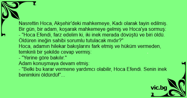 Nasrettin Hoca, Akşehir'deki mahkemeye, Kadı olarak tayin edilmiş. Bir gün, bir adam, koşarak mahkemeye gelmiş ve Hoca'ya sormuş: