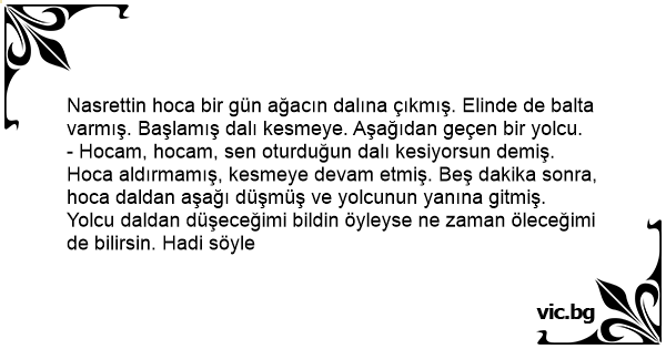 - Hocam, hocam, sen oturduğun dalı kesiyorsun demiş. Hoca aldırmamış, kesmeye devam etmiş. Beş dakika sonra, hoca daldan aşağı düşmüş ve yolcunun yanına gitmiş.