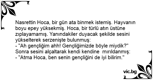 Nasrettin Hoca, bir gün ata binmek istemiş. Hayvanın boyu epey yüksekmiş. Hoca, bir türlü atın üstüne zıplayamamış. Yanındakiler duyacak şekilde sesini yükselterek serzenişte bulunmuş: - "Ah gençliğim ahh! Gençliğimizde böyle miydik?" Sonra sesini alçaltarak kendi kendine mırıldanmış: - "Atma Hoca, ben senin gençliğini de iyi bilirim."