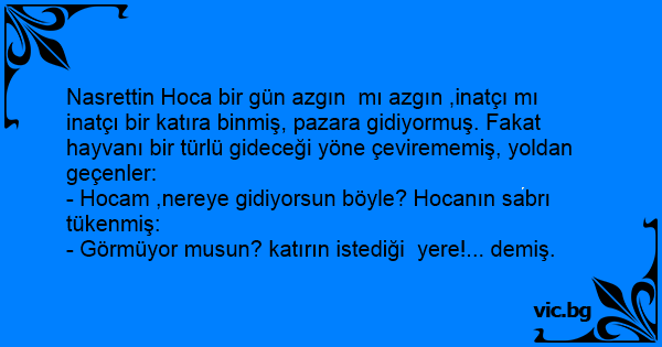Nasrettin Hoca bir gün azgın mı azgın ,inatçı mı inatçı bir katıra binmiş, pazara gidiyormuş. Fakat hayvanı bir türlü gideceği yöne çevirememiş, yoldan geçenler: