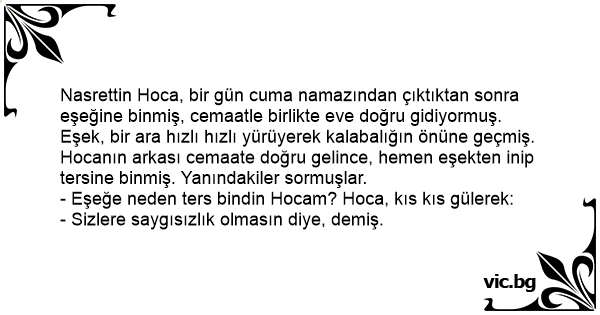 - Eşeğe neden ters bindin Hocam? Hoca, kıs kıs gülerek: