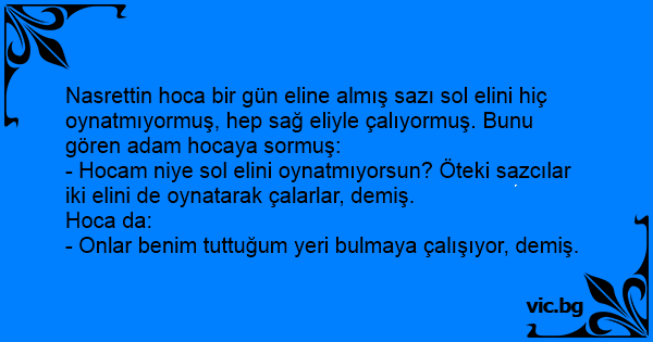 Nasrettin hoca bir gün eline almış sazı sol elini hiç oynatmıyormuş, hep sağ eliyle çalıyormuş. Bunu gören adam hocaya sormuş: