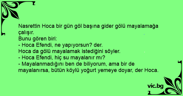 - Mayalanmadığını ben de biliyorum, ama bir de mayalanırsa, bütün köylü yoğurt yemeye doyar, der Hoca.