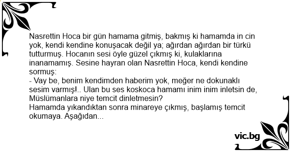 Nasrettin Hoca bir gün hamama gitmiş, bakmış ki hamamda in cin yok, kendi kendine konuşacak değil ya; ağırdan ağırdan bir türkü tutturmuş. Hocanın sesi öyle güzel çıkmış ki, kulaklarına inanamamış. Sesine hayran olan Nasrettin Hoca, kendi kendine sormuş: