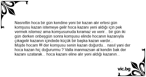 Nasrettin hoca bir gün kendine yeni bir kazan alır ertesi gün komşusu kazan istemeye gelir hoca kazanı yeni aldığı için pek vermek istemez ama komşusunuda kıramaz ve verir... bir gün iki gün derken onbeşgün sonra komşusu elinde hocanın kazanıyla çıkagelir kazanın içindede küçük bir başka kazan vardır...