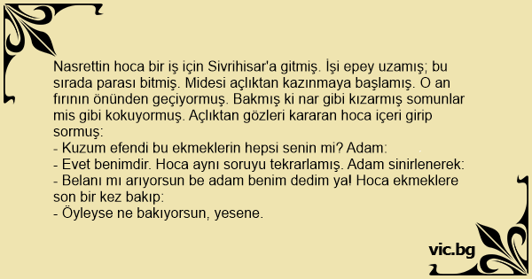Nasrettin hoca bir iş için Sivrihisar'a gitmiş. İşi epey uzamış; bu sırada parası bitmiş. Midesi açlıktan kazınmaya başlamış. O an fırının önünden geçiyormuş. Bakmış ki nar gibi kızarmış somunlar mis gibi kokuyormuş. Açlıktan gözleri kararan hoca içeri girip sormuş: