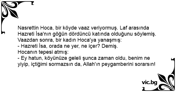 Nasrettin Hoca, bir köyde vaaz veriyormuş. Laf arasında Hazreti İsa'nın göğün dördüncü katında olduğunu söylemiş. Vaazdan sonra, bir kadın Hoca'ya yanaşmış: