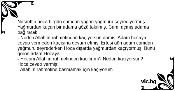 - Neden Allah’ın rahmetinden kaçıyorsun demiş. Adam hocaya cevap vermeden kaçışına devam etmiş. Ertesi gün adam camdan yağmuru seyrederken Hoca dışarda yağmurdan kaçıyormuş. Bunu gören adam Hocaya: