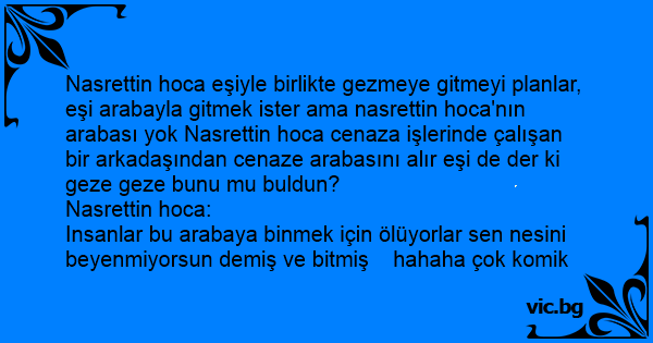 Nasrettin hoca eşiyle birlikte gezmeye gitmeyi planlar, eşi arabayla gitmek ister ama nasrettin hoca'nın arabası yok Nasrettin hoca cenaza işlerinde çalışan bir arkadaşından cenaze arabasını alır eşi de der ki geze geze bunu mu buldun?
