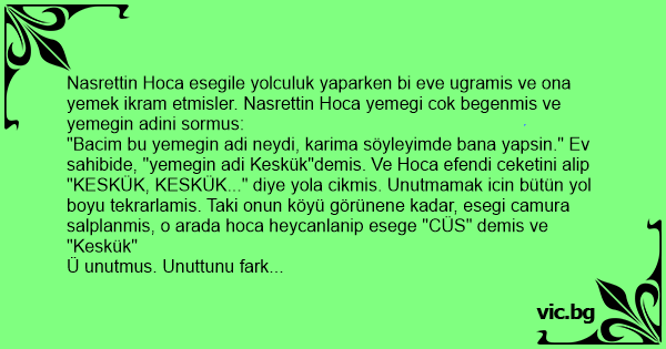 "Bacim bu yemegin adi neydi, karima söyleyimde bana yapsin." Ev sahibide, "yemegin adi Keskük"demis. Ve Hoca efendi ceketini alip "KESKÜK, KESKÜK..." diye yola cikmis. Unutmamak icin bütün yol boyu tekrarlamis. Taki onun köyü görünene kadar, esegi camura salplanmis, o arada hoca heycanlanip esege "CÜS" demis ve "Keskük"