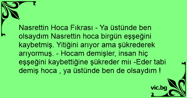 Nasrettin Hoca Fıkrası - Ya üstünde ben olsaydım Nasrettin hoca birgün eşşeğini kaybetmiş. Yitiğini arıyor ama şükrederek arıyormuş. - Hocam demişler, insan hiç eşşeğini kaybettiğine şükreder miı -Eder tabi demiş hoca , ya üstünde ben de olsaydım !