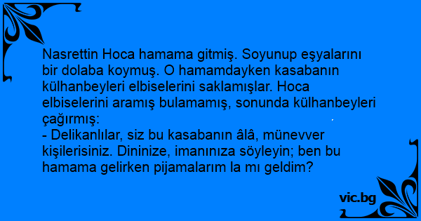 Nasrettin Hoca hamama gitmiş. Soyunup eşyalarını bir dolaba koymuş. O hamamdayken kasabanın külhanbeyleri elbiselerini saklamışlar. Hoca elbiselerini aramış bulamamış, sonunda külhanbeyleri çağırmış: