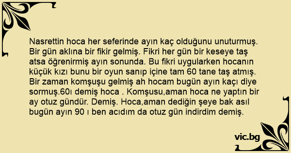 Nasrettin hoca her seferinde ayın kaç olduğunu unuturmuş. Bir gün aklına bir fikir gelmiş. Fikri her gün bir keseye taş atsa öğrenirmiş ayın sonunda. Bu fikri uygularken hocanın küçük kızı bunu bir oyun sanıp içine tam 60 tane taş atmış. Bir zaman komşuşu gelmiş ah hocam bugün ayın kaçı diye sormuş.60ı demiş hoca . Komşusu,aman hoca ne yaptın bir ay otuz gündür. Demiş. Hoca,aman dediğin şeye bak asıl bugün ayın 90 ı ben acıdım da otuz gün indirdim demiş.