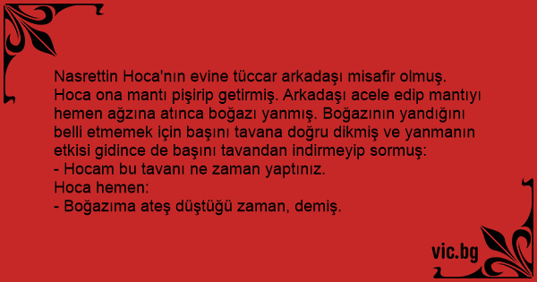 Nasrettin Hoca'nın evine tüccar arkadaşı misafir olmuş. Hoca ona mantı pişirip getirmiş. Arkadaşı acele edip mantıyı hemen ağzına atınca boğazı yanmış. Boğazının yandığını belli etmemek için başını tavana doğru dikmiş ve yanmanın etkisi gidince de başını tavandan indirmeyip sormuş: