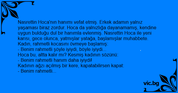 Nasrettin Hoca'nın hanımı vefat etmiş. Erkek adamın yalnız yaşaması biraz zordur. Hoca da yalnızlığa dayanamamış, kendine uygun bulduğu dul bir hanımla evlenmiş. Nasrettin Hoca ile yeni karısı, gece olunca, yatmışlar yatağa, başlamışlar muhabbete. Kadın, rahmetli kocasını övmeye başlamış: