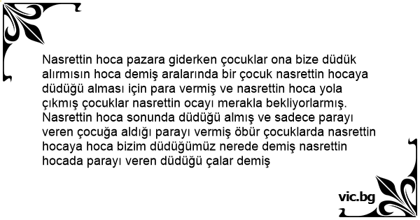 Nasrettin hoca pazara giderken çocuklar ona bize düdük alırmısın hoca demiş aralarında bir çocuk nasrettin hocaya düdüğü alması için para vermiş ve nasrettin hoca yola çıkmış çocuklar nasrettin ocayı merakla bekliyorlarmış. Nasrettin hoca sonunda düdüğü almış ve sadece parayı veren çocuğa aldığı parayı vermiş öbür çocuklarda nasrettin hocaya hoca bizim düdüğümüz nerede demiş nasrettin hocada parayı veren düdüğü çalar demiş