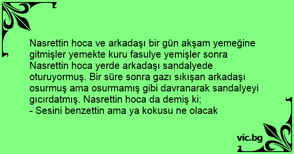 Nasrettin hoca ve arkadaşı bir gün akşam yemeğine gitmişler yemekte kuru fasulye yemişler sonra Nasrettin hoca yerde arkadaşı sandalyede oturuyormuş. Bir süre sonra gazı sıkışan arkadaşı osurmuş ama osurmamış gibi davranarak sandalyeyi gıcırdatmış. Nasrettin hoca da demiş ki;
