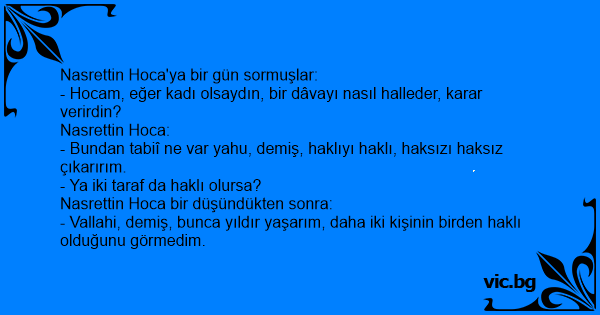 - Vallahi, demiş, bunca yıldır yaşarım, daha iki kişinin birden haklı olduğunu görmedim.