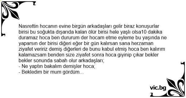 Nasrettin hocanın evine birgün arkadaşları gelir biraz konuşurlar birisi bu soğukta dışarıda kalan ölür birisi hele yaşlı olsa10 dakika duramaz hoca ben dururum der hocam etme eyleme bu yaşında ne yaparsın der birisi diğeri eğer bir gün kalırsan sana herzaman ziyafet veririz demiş diğerleri de bunu kabul etmiş hoca ben kalırım kalamazsam benden size ziyafet sonra hoca giyinip çıkar bekler bekler sonunda sabah olur arkadaşları;