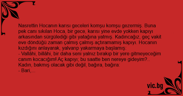 Nasrettin Hocanın karısı geceleri komşu komşu gezermiş. Buna pek canı sıkılan Hoca, bir gece, karısı yine evde yokken kapıyı arkasından sürgülediği gibi yatağına yatmış. Kadıncağız, geç vakit eve döndüğü zaman çalmış çalmış açtıramamış kapıyı. Hocanın kızdığını anlayarak, yalvarıp yakarmaya başlamış: