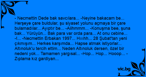 - Necmettin Dede bak savcılara... -Neyine bakacam be... Herşeye çare buldular, şu siyaset yolunu açmaya bir çare bulamadılar... Ayıptır be... -Aiihmmm... -Konuşma bee, şuna bak... Yürüyün... Bak para var orda para... At onu cebine... -!... -Necmettin Erbakan 1997... Hıııhh... 28 Şubat'tan yeni çıkmışım... Herkes karşımda... Hapse atmak istiyorlar... Altınoluk'u tercih ettim... Neden Altınoluk dersen, özel bir nedeni yok... Tamamen yargısal... -Hop... Hop... Hooop... -Zıplama kız gardiyan gibi. Başım ağırıyo zaten... Nasıl yapıyo deden?... -Tamamen yargısal...