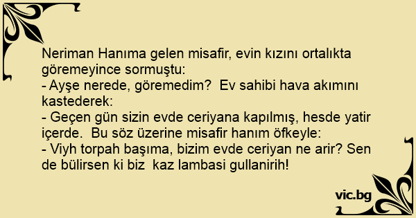 - Geçen gün sizin evde ceriyana kapılmış, hesde yatir içerde. Bu söz üzerine misafir hanım öfkeyle: