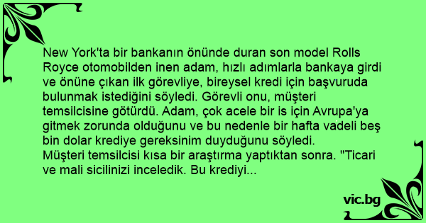 "Çok acelem var, uçağa yetişeceğim." dedi. "kapıdaki Rolls Royce' umu teminat olarak alabilirsiniz". Kredi işlemleri çok hızlı bir biçimde tamamlandı. Banka Rolls Royce otomobili bankanın garajına çektiler, adama da beş bin dolar krediyi verdiler.