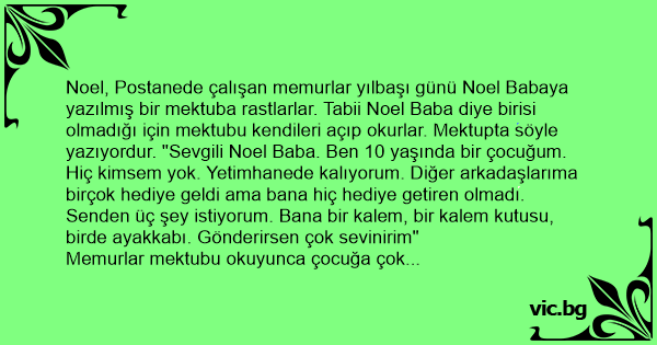 Noel, Postanede çalışan memurlar yılbaşı günü Noel Babaya yazılmış bir mektuba rastlarlar. Tabii Noel Baba diye birisi olmadığı için mektubu kendileri açıp okurlar. Mektupta söyle yazıyordur. "Sevgili Noel Baba. Ben 10 yaşında bir çocuğum. Hiç kimsem yok. Yetimhanede kalıyorum. Diğer arkadaşlarıma birçok hediye geldi ama bana hiç hediye getiren olmadı. Senden üç şey istiyorum. Bana bir kalem, bir kalem kutusu, birde ayakkabı. Gönderirsen çok sevinirim"