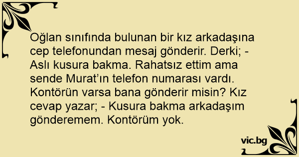 Oğlan sınıfında bulunan bir kız arkadaşına cep telefonundan mesaj gönderir. Derki; - Aslı kusura bakma. Rahatsız ettim ama sende Murat’ın telefon numarası vardı. Kontörün varsa bana gönderir misin? Kız cevap yazar; - Kusura bakma arkadaşım gönderemem. Kontörüm yok.