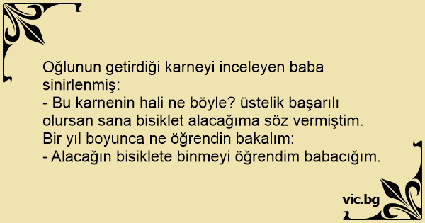 - Bu karnenin hali ne böyle? üstelik başarılı olursan sana bisiklet alacağıma söz vermiştim. Bir yıl boyunca ne öğrendin bakalım: