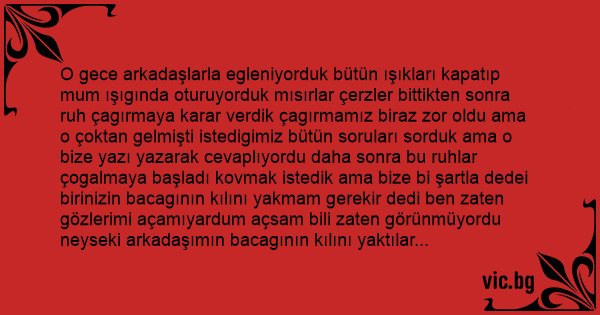 O gece arkadaşlarla egleniyorduk bütün ışıkları kapatıp mum ışıgında oturuyorduk mısırlar çerzler bittikten sonra ruh çagırmaya karar verdik çagırmamız biraz zor oldu ama o çoktan gelmişti istedigimiz bütün soruları sorduk ama o bize yazı yazarak cevaplıyordu daha sonra bu ruhlar çogalmaya başladı kovmak istedik ama bize bi şartla dedei birinizin bacagının kılını yakmam gerekir dedi ben zaten gözlerimi açamıyardum açsam bili zaten görünmüyordu neyseki arkadaşımın bacagının kılını yaktılar gidin dedigimizde biz gidiyoruz arkamızdan siyahlar geliyo diye kagıda yazdılar herşey şimdi başlıyodu yüzleri güzükmeyen ama oldukça karaya bürünmüş bir kişi vardı hepimizin arkadaşlarımın ve benim ne zaman ölecegimi söyledi ve gitti 2 ay önce idil arkadaşımızı kaybettik ve onun dedigi doru çıktı ve ben şimdi çok korkuyorum ailelerimizi bu duruma inandıramıyoruz arkadaşlar dualarınız bizde olsun