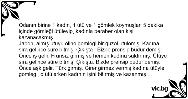 Japon, almış ütüyü eline gömleği bir güzel ütülemiş. Kadına sıra gelince süre bitmiş. Çıkışta : Bizde prensip budur demiş: Önce iş gelir. Fransız girmiş ve hemen kadına saldırmış. Ütüye sıra gelince süre bitmiş. Çıkışta: Bizde prensip budur demiş: Önce aşk gelir. Türk girmiş. Girer girmez vermiş kadına ütüyle gömlegi, o ütülerken kadının işini bitirmiş ve kazanmış. Çıkışta: Bizde prensip budur demiş: .. Çalışanı ?ikerler...