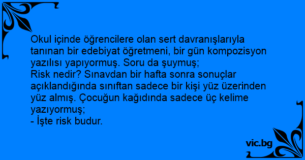 Risk nedir? Sınavdan bir hafta sonra sonuçlar açıklandığında sınıftan sadece bir kişi yüz üzerinden yüz almış. Çocuğun kağıdında sadece üç kelime yazıyormuş;