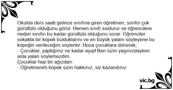 Okulda ders saati gelince sınıfına giren öğretmen, sınıfın çok gürültülü olduğunu görür. Hemen sınıfı susturur ve öğrencilere neden sınıfın bu kadar gürültülü olduğunu sorar. Öğrenciler sokakta bir köpek bulduklarını ve en büyük yalanı söyleyene bu köpeğin verileceğini söylerler. Hoca çocuklara dönerek;