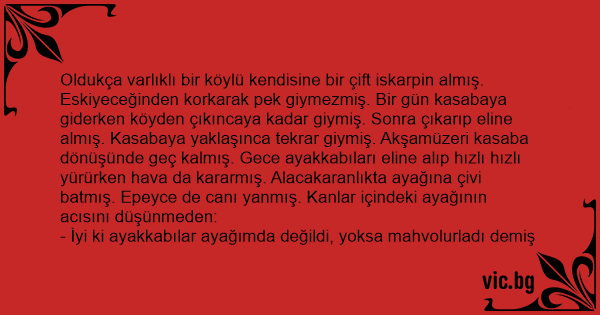 Oldukça varlıklı bir köylü kendisine bir çift iskarpin almış. Eskiyeceğinden korkarak pek giymezmiş. Bir gün kasabaya giderken köyden çıkıncaya kadar giymiş. Sonra çıkarıp eline almış. Kasabaya yaklaşınca tekrar giymiş. Akşamüzeri kasaba dönüşünde geç kalmış. Gece ayakkabıları eline alıp hızlı hızlı yürürken hava da kararmış. Alacakaranlıkta ayağına çivi batmış. Epeyce de canı yanmış. Kanlar içindeki ayağının acısını düşünmeden: