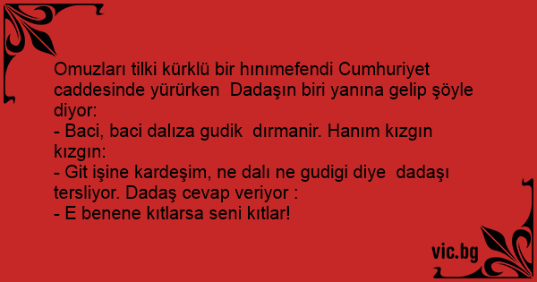 Omuzları tilki kürklü bir hınımefendi Cumhuriyet caddesinde yürürken Dadaşın biri yanına gelip şöyle diyor: