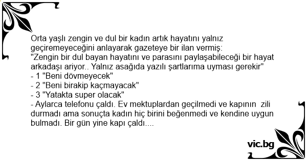 "Zengin bir dul bayan hayatını ve parasını paylaşabileceği bir hayat arkadaşı ariyor.. Yalnız asağıda yazılı şartlarıma uyması gerekir"