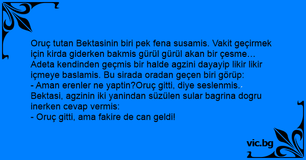 Oruç tutan Bektasinin biri pek fena susamis. Vakit geçirmek için kirda giderken bakmis gürül gürül akan bir çesme… Adeta kendinden geçmis bir halde agzini dayayip likir likir içmeye baslamis. Bu sirada oradan geçen biri görüp: