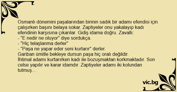 İhtimal adamı kurtarırken kadı ile bozuşmaktan korkmaktadır. Son celse yapılır ve karar idamdır. Zaptiyeler adamı iki kolundan tutmuş götürürlerken gariban kapıdan paşayı görür, son bir ümitle ona doğru hamle yapar. Neredeyse kurtar beni paşam diye haykıracaktır. Paşa bu ihtimalden korkarak, zaptiyelerin kolundaki garibanın yalvaran gözlerine bakarak yalnızca onun duyabileceği bir ses tonuyla.