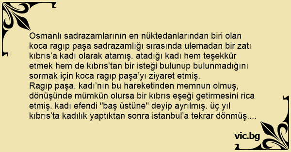 Osmanlı sadrazamlarının en nüktedanlarından biri olan koca ragıp paşa sadrazamlığı sırasında ulemadan bir zatı kıbrıs’a kadı olarak atamış. atadığı kadı hem teşekkür etmek hem de kıbrıs’tan bir isteği bulunup bulunmadığını sormak için koca ragıp paşa’yı ziyaret etmiş.
