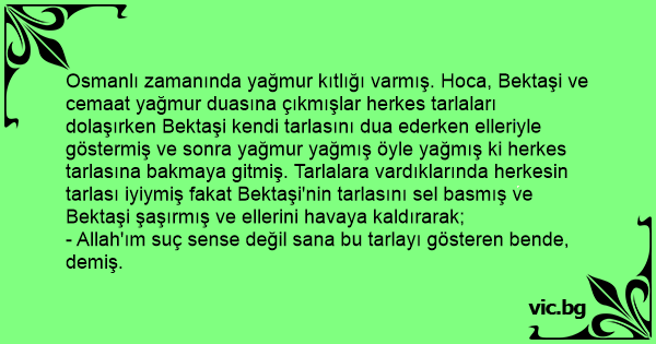 Osmanlı zamanında yağmur kıtlığı varmış. Hoca, Bektaşi ve cemaat yağmur duasına çıkmışlar herkes tarlaları dolaşırken Bektaşi kendi tarlasını dua ederken elleriyle göstermiş ve sonra yağmur yağmış öyle yağmış ki herkes tarlasına bakmaya gitmiş. Tarlalara vardıklarında herkesin tarlası iyiymiş fakat Bektaşi'nin tarlasını sel basmış ve Bektaşi şaşırmış ve ellerini havaya kaldırarak;
