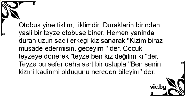 Otobus yine tiklim, tiklimdir. Duraklarin birinden yasli bir teyze otobuse biner. Hemen yaninda duran uzun sacli erkegi kiz sanarak "Kizim biraz musade edermisin, geceyim " der. Cocuk teyzeye donerek "teyze ben kiz değilim ki "der. Teyze bu sefer daha sert bir uslupla "Ben senin kizmi kadinmi oldugunu nereden bileyim" der.
