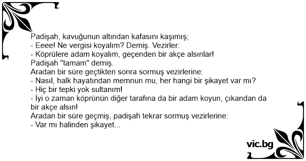 - Eeee! Ne vergisi koyalım? Demiş. Vezirler: