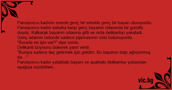 Pansiyoncu kadının evinde genç bir erkekle genç bir bayan oturuyordu. Pansiyoncu kadın sabaha karşı genç bayanın odasında bir gürültü duydu. Kalkarak bayanın odasına gitti ve orda delikanlıyı yakaladı.