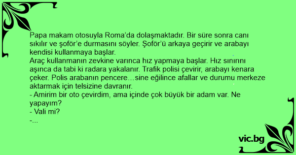Cica a venit papa in Romania. Si mergea el cu masina condusa de sofer si cum nu-i placea felul in care conducea masina ii spune sa se dea la o parte ca sa conduca papa. Incepe papa si baga viteza...