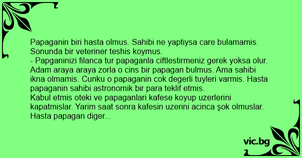 Kabul etmis oteki ve papaganlari kafese koyup uzerlerini kapatmislar. Yarim saat sonra kafesin uzerini acinca şok olmuslar. Hasta papagan diger papaganin butun tuylerni yolmuş. Papaganin sahibi bagirmis -sen ne yaptin!