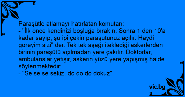 - "İlk önce kendinizi boşluğa bırakın. Sonra 1 den 10'a kadar sayıp, şu ipi çekin paraşütünüz açılır. Haydi göreyim sizi" der. Tek tek aşağı iteklediği askerlerden birinin paraşütü açılmadan yere çakılır. Doktorlar, ambulanslar yetişir, askerin yüzü yere yapışmış halde söylenmektedir: