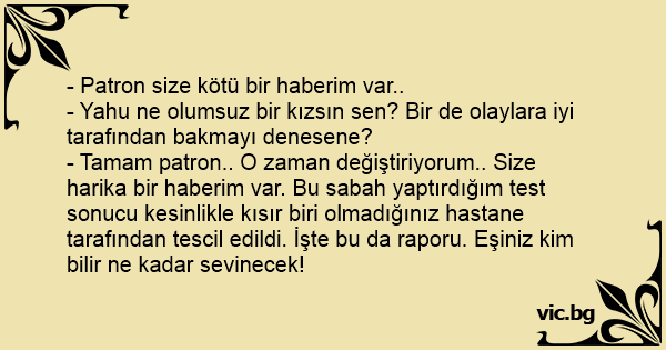 - Tamam patron.. O zaman değiştiriyorum.. Size harika bir haberim var. Bu sabah yaptırdığım test sonucu kesinlikle kısır biri olmadığınız hastane tarafından tescil edildi. İşte bu da raporu. Eşiniz kim bilir ne kadar sevinecek!