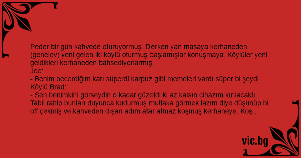 Peder bir gün kahvede oturuyormuş. Derken yan masaya kerhaneden (genelev) yeni gelen iki köylü oturmuş başlamışlar konuşmaya. Köylüler yeni geldikleri kerhaneden bahsediyorlarmış.