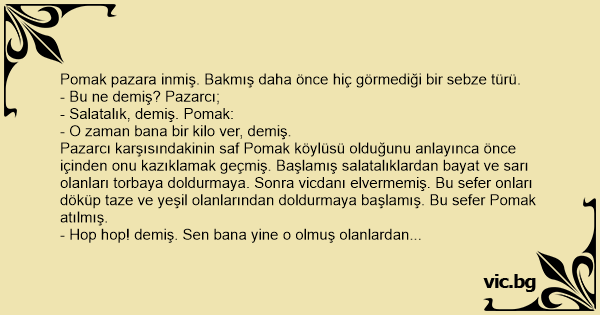 Pazarcı karşısındakinin saf Pomak köylüsü olduğunu anlayınca önce içinden onu kazıklamak geçmiş. Başlamış salatalıklardan bayat ve sarı olanları torbaya doldurmaya. Sonra vicdanı elvermemiş. Bu sefer onları döküp taze ve yeşil olanlarından doldurmaya başlamış. Bu sefer Pomak atılmış.